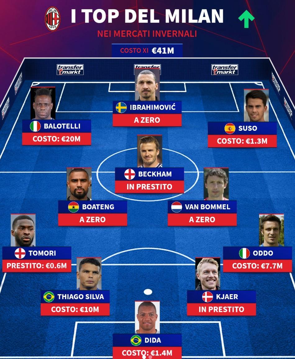 北京时间1月18日,德转评选了AC米兰队史冬窗引援的最成功11人阵容,伊布拉希莫维奇、巴洛特利、贝克汉姆以及蒂亚戈-席尔瓦上榜。